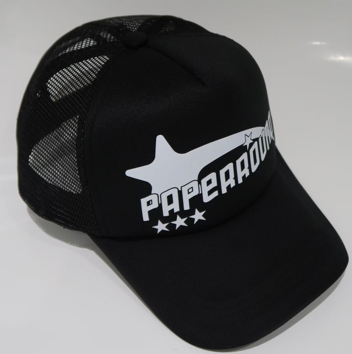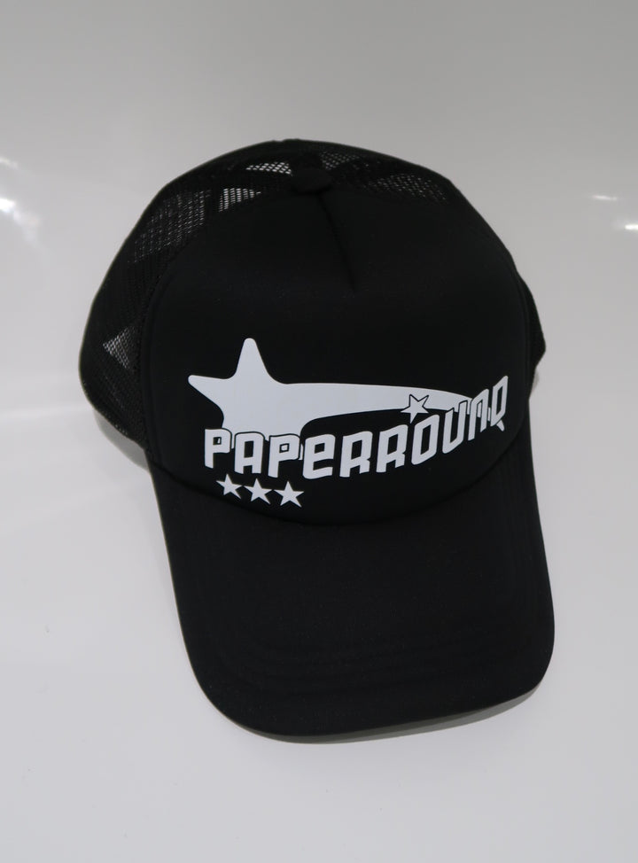 This black trucker hat is printed with the Anime classic PAPERROUND front print design in white. Made from 100% Polye...